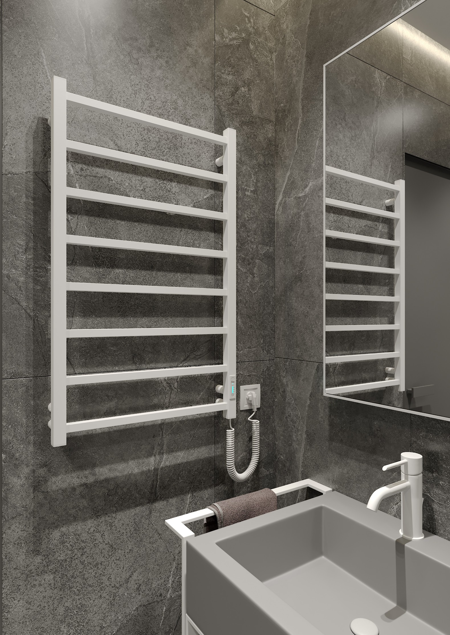 Grzejnik łazienkowy jest całkiem elektryczny, bardzo wygodny w korzystaniu, nie jest wodny, nie potrzebuje podłączenia do systemu centralnego ogrzewania. Ten grzejnik można podłączyć w jakimkolwiek miejscu, gdzie jest dostęp do gniazdka elektrycznego. Urządzenie jest z suchym kablem w środku i nie potrzebuje żadnych dodatkowych płynów, warto tylko podłączyć go do prądu i działa! Nagrzewa się do maksymalnej temperatury w ciągu kilku minut. Jest to niezwykle wygodne, gdy zależy na szybkim wysuszeniu prania lub podgrzaniu ręcznika dla przyjemnego wycierania się po wyjściu z kąpieli.Przewód zasilający można podłączyć do grzejnika samodzielnie z lewej lub prawej strony na życzenie, idealnie dopasowując urządzenie do miejsca rozmieszczenia gniazdka elektrycznego w łazience. Co więcej, jeżeli łazienka jest na etapie remontu to w zestawie od razu są wszystkie niezbędne detale do ukrytego montażu podtynkowego, czyli bez widocznego na zewnątrz przewodu zasilającego. Jest to dobre rozwiązanie dla stworzenia minimalistycznego wnętrza i jeszcze bardziej bezpiecznego korzystania z urządzenia elektrycznego w pomieszczeniu z wysokim poziomem wilgotności.Grzejnik został wyposażony w sterownik, który pozwala regulować temperaturę urządzenia w trzech trybach temperaturowych (45°- 55°- 65°C) oraz posiada jako opcję dodatkową timer 3h. Po 3 godzinach pracy w tym trybie grzejnik wyłącza się samodzielnie. Jest energooszczędny, pobiera bardzo mało prądu. Zaoszczędzi zużycie prądu do 70% miesięcznie.