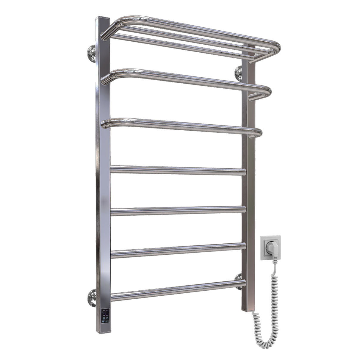 Elektryczny grzejnik łazienkowy Navin Fortis z półką posiada kolektory wykonane z kwadratowej rury o profilu 30x30 mm oraz zworki wykonane z okrągłych rur o średnicy 20 mm, które równomiernie rozprowadzają ciepło po całym wieszaku.