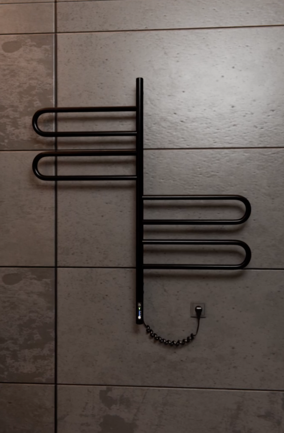 Elektryczny grzejnik łazienkowy Fluger ze stali niskowęglowej ma 4 ruchome przęsła, każde z których obraca się o 180° niezależnie od drugiego.Jest to grzejnik całkiem elektryczny, bardzo wygodny w korzystaniu, nie jest wodny, nie potrzebuje podłączenia do systemu centralnego ogrzewania. Ten grzejnik można podłączyć w jakimkolwiek miejscu, gdzie jest dostęp do gniazdka elektrycznego. Urządzenie jest z suchym kablem w środku i nie potrzebuje żadnych dodatkowych płynów, warto tylko podłączyć go do prądu i działa! Nagrzewa się do maksymalnej temperatury w ciągu kilku minut. Jest to niezwykle wygodne, gdy zależy na szybkim wysuszeniu prania lub podgrzaniu ręcznika dla przyjemnego wycierania się po wyjściu z kąpieli.Jeżeli łazienka jest na etapie remontu jest możliwość ukrytego systemu montowania podtynkowego, bez widocznego na zewnątrz przewodu zasilającego. Idealne rozwiązanie dla minimalistycznego wnętrza i bezpiecznego korzystania z urządzenia elektrycznego.Grzejnik został wyposażony w sterownik, który pozwala regulować temperaturę urządzenia w trzech trybach temperaturowych (45°- 55°- 65°C) oraz posiada jako opcję dodatkową timer 3h. Po 3 godzinach pracy w tym trybie grzejnik wyłącza się samodzielnie. Jest energooszczędny, pobiera bardzo mało prądu. Zaoszczędzi zużycie prądu do 70% miesięcznie.