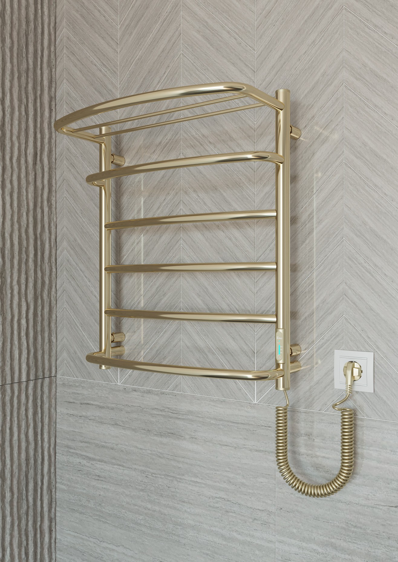 Grzejnik łazienkowy Kaskada z półką jest całkiem elektryczny, bardzo wygodny w korzystaniu, nie jest wodny, nie potrzebuje podłączenia do systemu centralnego ogrzewania. Ten grzejnik można podłączyć w jakimkolwiek miejscu, gdzie jest dostęp do gniazdka elektrycznego. Urządzenie jest z suchym kablem w środku i nie potrzebuje żadnych dodatkowych płynów, warto tylko podłączyć go do prądu i działa! Nagrzewa się do maksymalnej temperatury w ciągu kilku minut. Jest to niezwykle wygodne, gdy zależy na szybkim wysuszeniu prania lub podgrzaniu ręcznika dla przyjemnego wycierania się po wyjściu z kąpieli. Półka pozwala na wygodne przechowywanie ręczników.Przewód zasilający można podłączyć do grzejnika samodzielnie z lewej lub prawej strony na życzenie, idealnie dopasowując urządzenie do miejsca rozmieszczenia gniazdka elektrycznego w łazience. Co więcej, jeżeli łazienka jest na etapie remontu to w zestawie od razu są wszystkie niezbędne detale do ukrytego montażu podtynkowego, czyli bez widocznego na zewnątrz przewodu zasilającego. Jest to dobre rozwiązanie dla stworzenia minimalistycznego wnętrza i jeszcze bardziej bezpiecznego korzystania z urządzenia elektrycznego w pomieszczeniu z wysokim poziomem wilgotności.Grzejnik został wyposażony w sterownik, który pozwala regulować temperaturę urządzenia w trzech trybach temperaturowych (45°- 55°- 65°C) oraz posiada jako opcję dodatkową timer 3h. Po 3 godzinach pracy w tym trybie grzejnik wyłącza się samodzielnie. Jest energooszczędny, pobiera bardzo mało prądu. Zaoszczędzi zużycie prądu do 70% miesięcznie.Suszarka łazienkowa elektryczna Kaskada z półką Gold jest wykonana ze stali nierdzewnej, a jej powierzchnia złocona metodą PVD. Idealnie odpolerowana złota powłoka zachowuje swoje charakterystyki techniczne przez dziesiątki lat. Lustrzana powierzchnia urządzenia o wyszukanym złotym odcieniu podkreśli luksusową atmosferę wnętrza łazienki. Złoty odcień grzejnika łazienkowego marki Elna-Service idealnie pasuje do złotych baterii Omnires i Grohe.