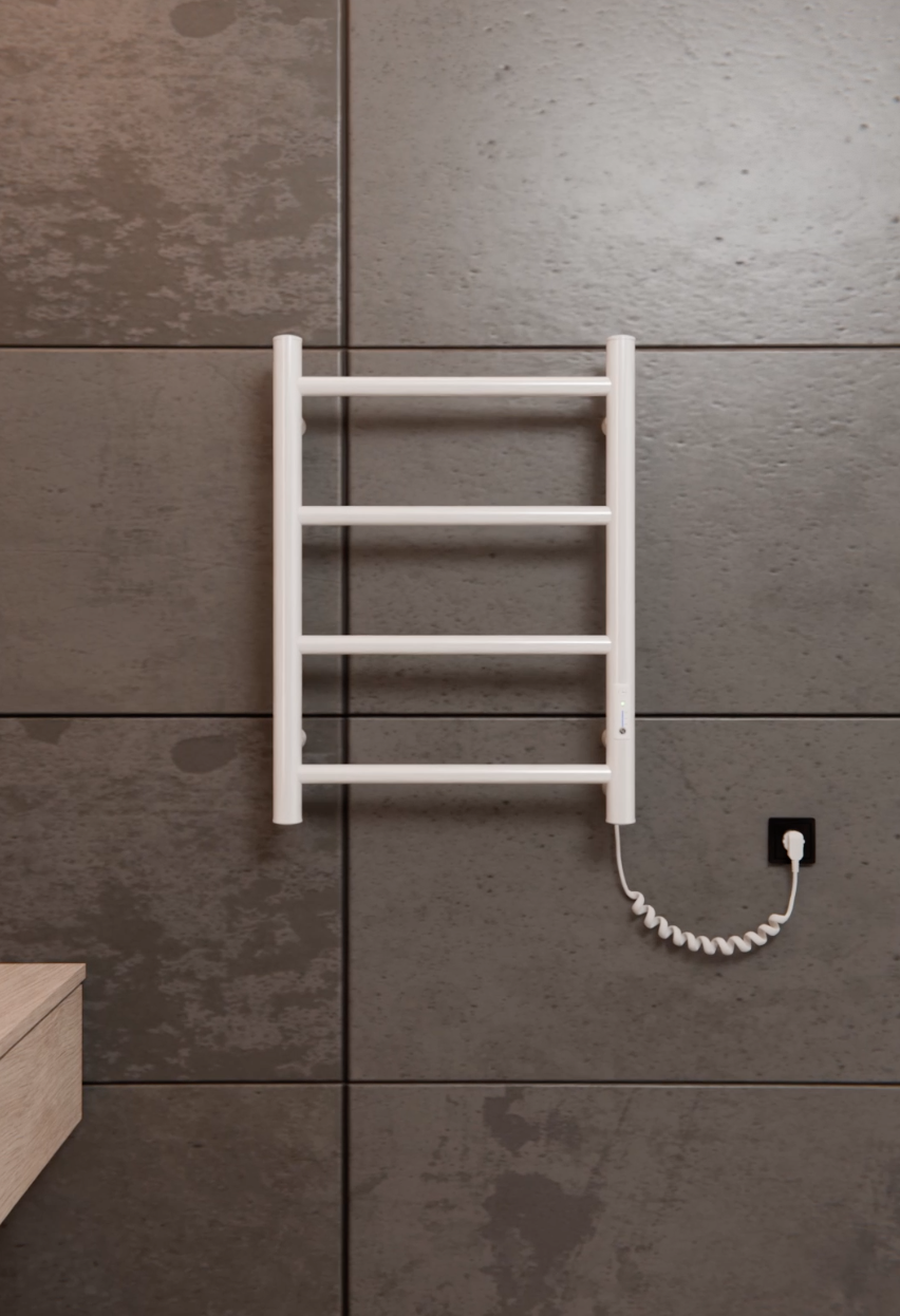 Grzejnik łazienkowy jest całkiem elektryczny, bardzo wygodny w korzystaniu, nie jest wodny, nie potrzebuje podłączenia do systemu centralnego ogrzewania. Ten grzejnik można podłączyć w jakimkolwiek miejscu, gdzie jest dostęp do gniazdka elektrycznego. Urządzenie jest z suchym kablem w środku i nie potrzebuje żadnych dodatkowych płynów, warto tylko podłączyć go do prądu i działa! Nagrzewa się do maksymalnej temperatury w ciągu kilku minut. Jest to niezwykle wygodne, gdy zależy na szybkim wysuszeniu prania lub podgrzaniu ręcznika dla przyjemnego wycierania się po wyjściu z kąpieli.Przewód zasilający można podłączyć do grzejnika samodzielnie z lewej lub prawej strony na życzenie, idealnie dopasowując urządzenie do miejsca rozmieszczenia gniazdka elektrycznego w łazience. Co więcej, jeżeli łazienka jest na etapie remontu to w zestawie od razu są wszystkie niezbędne detale do ukrytego montażu podtynkowego, czyli bez widocznego na zewnątrz przewodu zasilającego. Jest to dobre rozwiązanie dla stworzenia minimalistycznego wnętrza i jeszcze bardziej bezpiecznego korzystania z urządzenia elektrycznego w pomieszczeniu z wysokim poziomem wilgotności.Grzejnik został wyposażony w sterownik, który pozwala regulować temperaturę urządzenia w trzech trybach temperaturowych (45°- 55°- 65°C) oraz posiada jako opcję dodatkową timer 3h. Po 3 godzinach pracy w tym trybie grzejnik wyłącza się samodzielnie. Jest energooszczędny, pobiera bardzo mało prądu. Zaoszczędzi zużycie prądu do 70% miesięcznie.