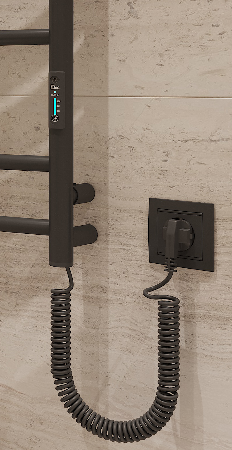 Grzejnik łazienkowy jest całkiem elektryczny, bardzo wygodny w korzystaniu, nie jest wodny, nie potrzebuje podłączenia do systemu centralnego ogrzewania. Ten grzejnik można podłączyć w jakimkolwiek miejscu, gdzie jest dostęp do gniazdka elektrycznego. Urządzenie jest z suchym kablem w środku i nie potrzebuje żadnych dodatkowych płynów, warto tylko podłączyć go do prądu i działa! Nagrzewa się do maksymalnej temperatury w ciągu kilku minut. Jest to niezwykle wygodne, gdy zależy na szybkim wysuszeniu prania lub podgrzaniu ręcznika dla przyjemnego wycierania się po wyjściu z kąpieli.Przewód zasilający można podłączyć do grzejnika samodzielnie z lewej lub prawej strony na życzenie, idealnie dopasowując urządzenie do miejsca rozmieszczenia gniazdka elektrycznego w łazience. Co więcej, jeżeli łazienka jest na etapie remontu to w zestawie od razu są wszystkie niezbędne detale do ukrytego montażu podtynkowego, czyli bez widocznego na zewnątrz przewodu zasilającego. Jest to dobre rozwiązanie dla stworzenia minimalistycznego wnętrza i jeszcze bardziej bezpiecznego korzystania z urządzenia elektrycznego w pomieszczeniu z wysokim poziomem wilgotności.Grzejnik został wyposażony w sterownik, który pozwala regulować temperaturę urządzenia w trzech trybach temperaturowych (45°- 55°- 65°C) oraz posiada jako opcję dodatkową timer 3h. Po 3 godzinach pracy w tym trybie grzejnik wyłącza się samodzielnie. Jest energooszczędny, pobiera bardzo mało prądu. Zaoszczędzi zużycie prądu do 70% miesięcznie.