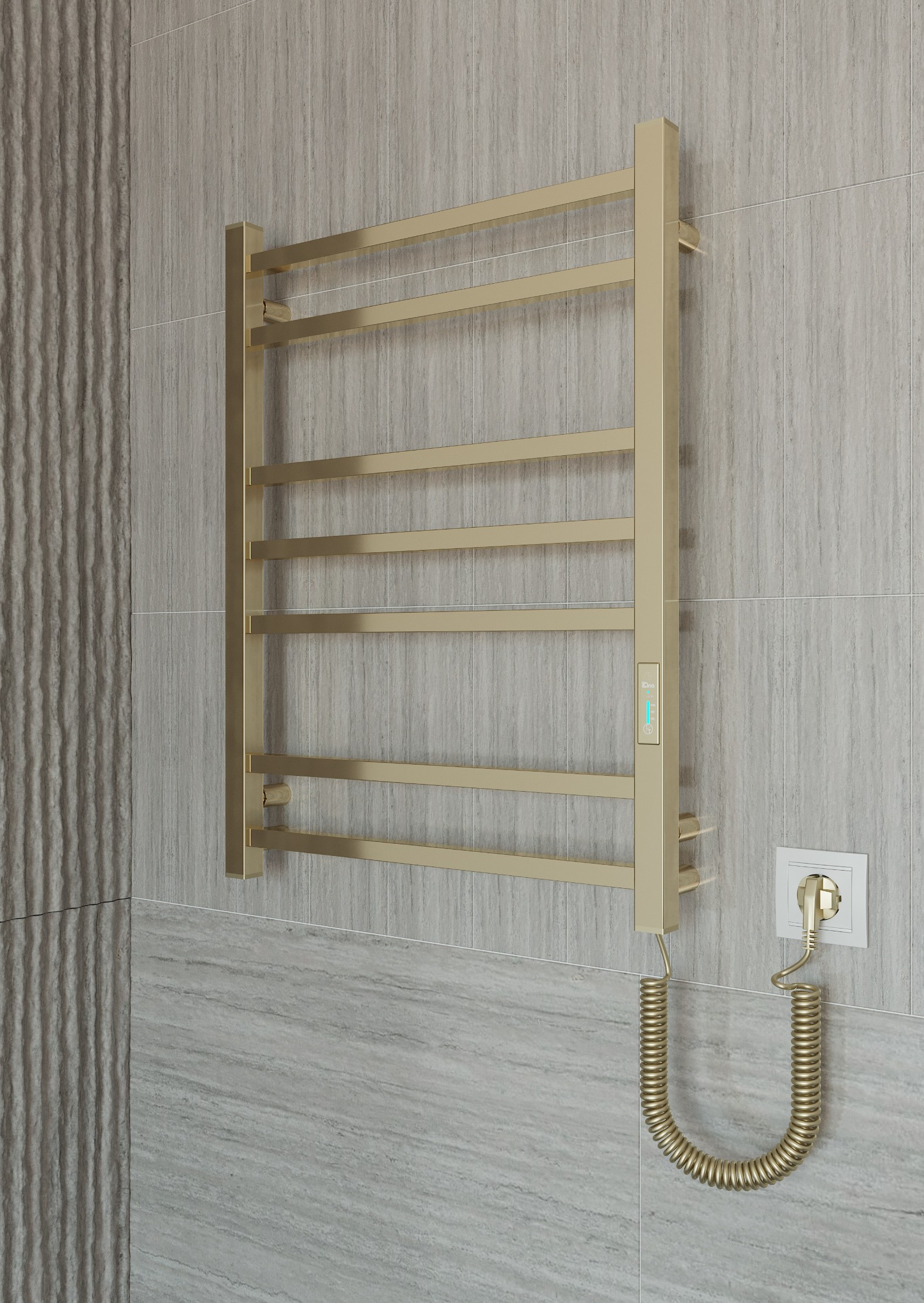 Grzejnik łazienkowy jest całkiem elektryczny, bardzo wygodny w korzystaniu, nie jest wodny, nie potrzebuje podłączenia do systemu centralnego ogrzewania. Ten grzejnik można podłączyć w jakimkolwiek miejscu, gdzie jest dostęp do gniazdka elektrycznego. Urządzenie jest z suchym kablem w środku i nie potrzebuje żadnych dodatkowych płynów, warto tylko podłączyć go do prądu i działa! Nagrzewa się do maksymalnej temperatury w ciągu kilku minut. Jest to niezwykle wygodne, gdy zależy na szybkim wysuszeniu prania lub podgrzaniu ręcznika dla przyjemnego wycierania się po wyjściu z kąpieli.Przewód zasilający można podłączyć do grzejnika samodzielnie z lewej lub prawej strony na życzenie, idealnie dopasowując urządzenie do miejsca rozmieszczenia gniazdka elektrycznego w łazience. Co więcej, jeżeli łazienka jest na etapie remontu to w zestawie od razu są wszystkie niezbędne detale do ukrytego montażu podtynkowego, czyli bez widocznego na zewnątrz przewodu zasilającego. Jest to dobre rozwiązanie dla stworzenia minimalistycznego wnętrza i jeszcze bardziej bezpiecznego korzystania z urządzenia elektrycznego w pomieszczeniu z wysokim poziomem wilgotności.Grzejnik został wyposażony w sterownik, który pozwala regulować temperaturę urządzenia w trzech trybach temperaturowych (45°- 55°- 65°C) oraz posiada jako opcję dodatkową timer 3h. Po 3 godzinach pracy w tym trybie grzejnik wyłącza się samodzielnie. Jest energooszczędny, pobiera bardzo mało prądu. Zaoszczędzi zużycie prądu do 70% miesięcznie.Suszarka łazienkowa elektryczna Ladder Elite 7 Gold jest wykonana ze stali nierdzewnej, a jej powierzchnia złocona metodą PVD. Idealnie odpolerowana złota powłoka zachowuje swoje charakterystyki techniczne przez dziesiątki lat. Lustrzana powierzchnia urządzenia o wyszukanym złotym odcieniu podkreśli luksusową atmosferę wnętrza łazienki. Złoty odcień grzejnika łazienkowego marki Elna-Service idealnie pasuje do złotych baterii Omnires i Grohe.