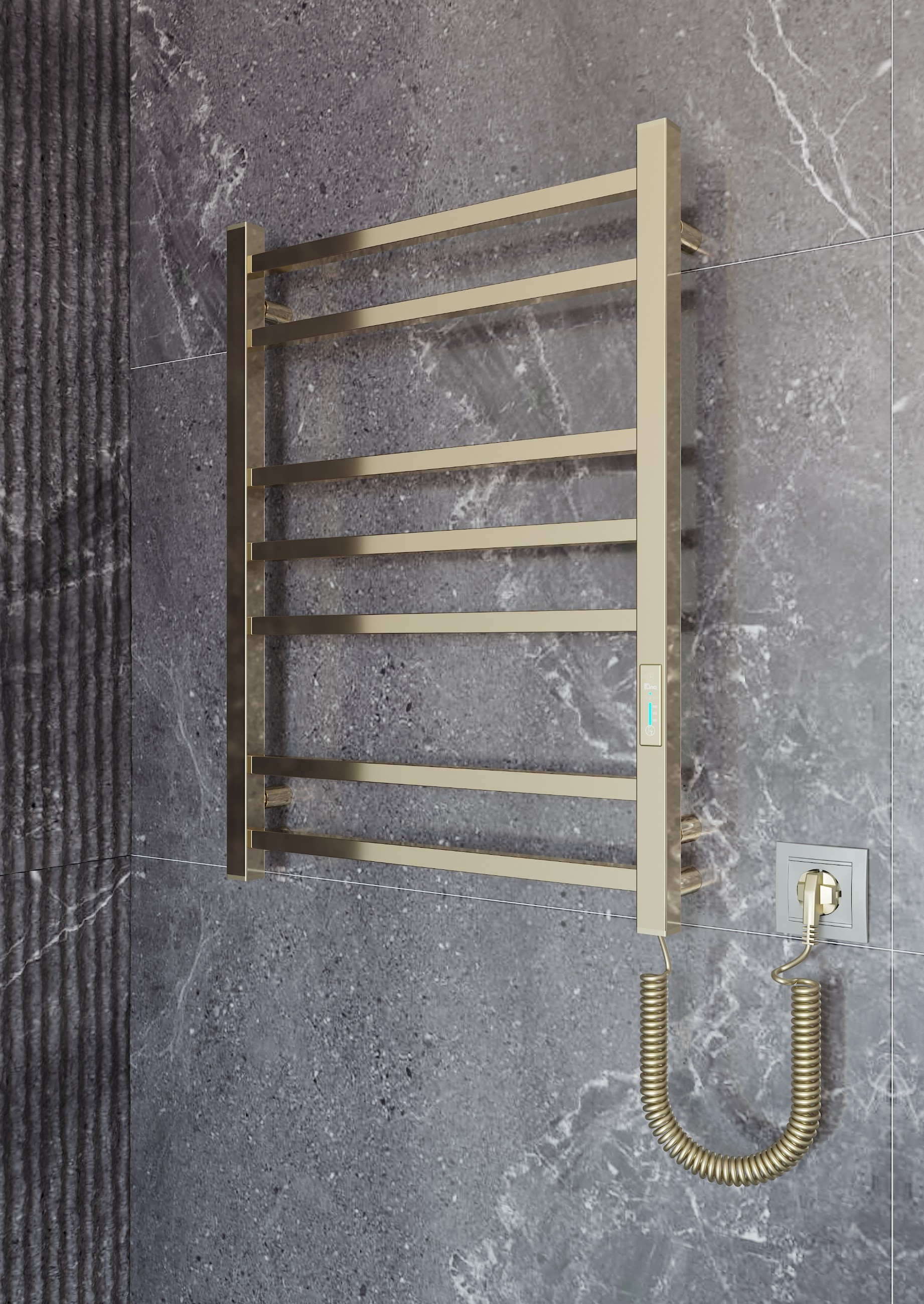 Grzejnik łazienkowy jest całkiem elektryczny, bardzo wygodny w korzystaniu, nie jest wodny, nie potrzebuje podłączenia do systemu centralnego ogrzewania. Ten grzejnik można podłączyć w jakimkolwiek miejscu, gdzie jest dostęp do gniazdka elektrycznego. Urządzenie jest z suchym kablem w środku i nie potrzebuje żadnych dodatkowych płynów, warto tylko podłączyć go do prądu i działa! Nagrzewa się do maksymalnej temperatury w ciągu kilku minut. Jest to niezwykle wygodne, gdy zależy na szybkim wysuszeniu prania lub podgrzaniu ręcznika dla przyjemnego wycierania się po wyjściu z kąpieli.Przewód zasilający można podłączyć do grzejnika samodzielnie z lewej lub prawej strony na życzenie, idealnie dopasowując urządzenie do miejsca rozmieszczenia gniazdka elektrycznego w łazience. Co więcej, jeżeli łazienka jest na etapie remontu to w zestawie od razu są wszystkie niezbędne detale do ukrytego montażu podtynkowego, czyli bez widocznego na zewnątrz przewodu zasilającego. Jest to dobre rozwiązanie dla stworzenia minimalistycznego wnętrza i jeszcze bardziej bezpiecznego korzystania z urządzenia elektrycznego w pomieszczeniu z wysokim poziomem wilgotności.Grzejnik został wyposażony w sterownik, który pozwala regulować temperaturę urządzenia w trzech trybach temperaturowych (45°- 55°- 65°C) oraz posiada jako opcję dodatkową timer 3h. Po 3 godzinach pracy w tym trybie grzejnik wyłącza się samodzielnie. Jest energooszczędny, pobiera bardzo mało prądu. Zaoszczędzi zużycie prądu do 70% miesięcznie.Suszarka łazienkowa elektryczna Ladder Elite 7 Gold jest wykonana ze stali nierdzewnej, a jej powierzchnia złocona metodą PVD. Idealnie odpolerowana złota powłoka zachowuje swoje charakterystyki techniczne przez dziesiątki lat. Lustrzana powierzchnia urządzenia o wyszukanym złotym odcieniu podkreśli luksusową atmosferę wnętrza łazienki. Złoty odcień grzejnika łazienkowego marki Elna-Service idealnie pasuje do złotych baterii Omnires i Grohe.