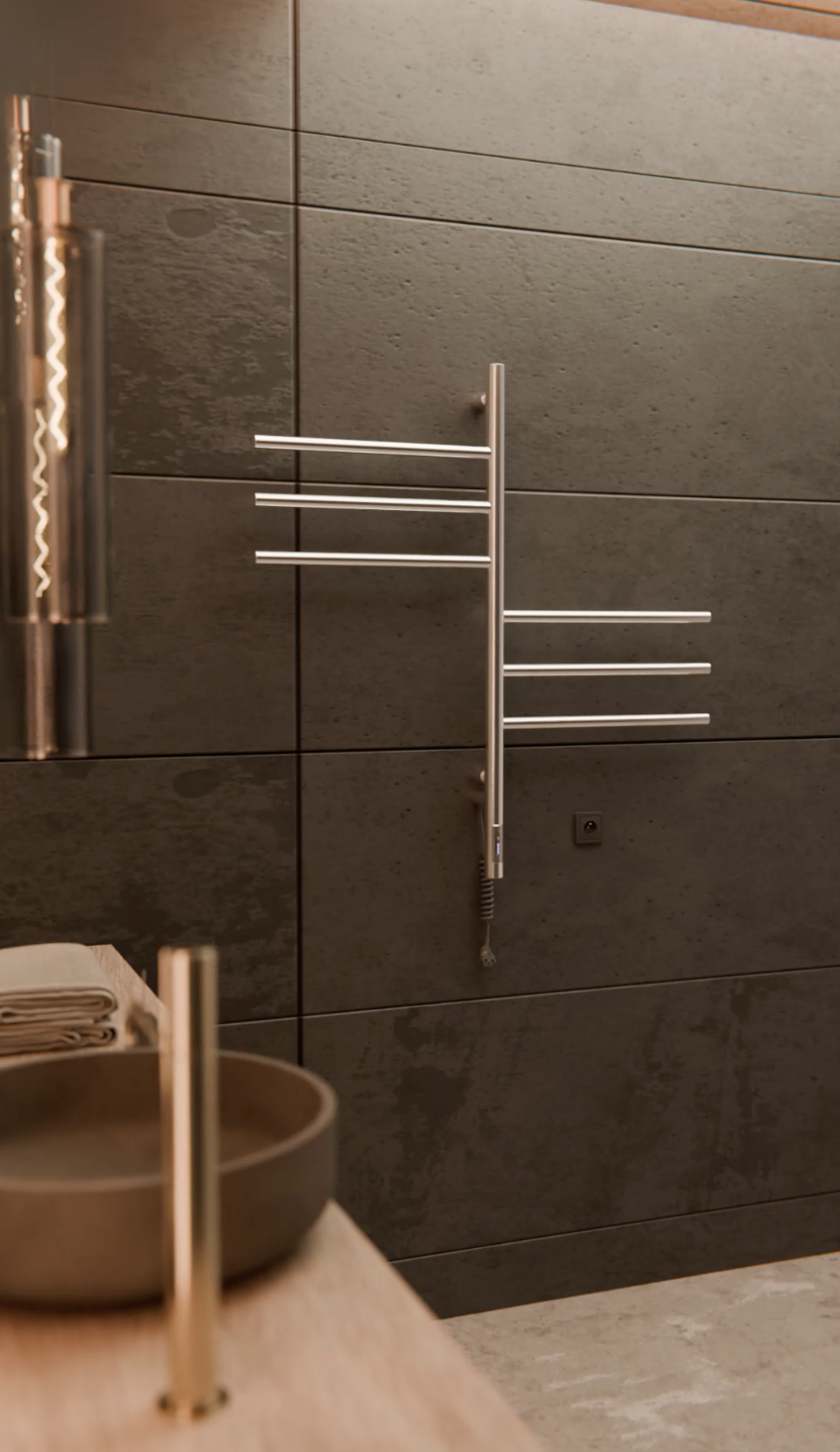 Elektryczny grzejnik łazienkowy Wertykal ze stali nierdzewnej ma 6 ruchomych przęseł, każde z których obraca się o 180° niezależnie od drugiego.Jest to grzejnik całkiem elektryczny, bardzo wygodny w korzystaniu, nie jest wodny, nie potrzebuje podłączenia do systemu centralnego ogrzewania. Ten grzejnik można podłączyć w jakimkolwiek miejscu, gdzie jest dostęp do gniazdka elektrycznego. Urządzenie jest z suchym kablem w środku i nie potrzebuje żadnych dodatkowych płynów, warto tylko podłączyć go do prądu i działa! Nagrzewa się do maksymalnej temperatury w ciągu kilku minut. Jest to niezwykle wygodne, gdy zależy na szybkim wysuszeniu prania lub podgrzaniu ręcznika dla przyjemnego wycierania się po wyjściu z kąpieli.Jeżeli łazienka jest na etapie remontu jest możliwość ukrytego systemu montowania podtynkowego, bez widocznego na zewnątrz przewodu zasilającego. Idealne rozwiązanie dla minimalistycznego wnętrza i bezpiecznego korzystania z urządzenia elektrycznego.Grzejnik został wyposażony w sterownik, który pozwala regulować temperaturę urządzenia w trzech trybach temperaturowych (45°- 55°- 65°C) oraz posiada jako opcję dodatkową timer 3h. Po 3 godzinach pracy w tym trybie grzejnik wyłącza się samodzielnie. Jest energooszczędny, pobiera bardzo mało prądu. Zaoszczędzi zużycie prądu do 70% miesięcznie.