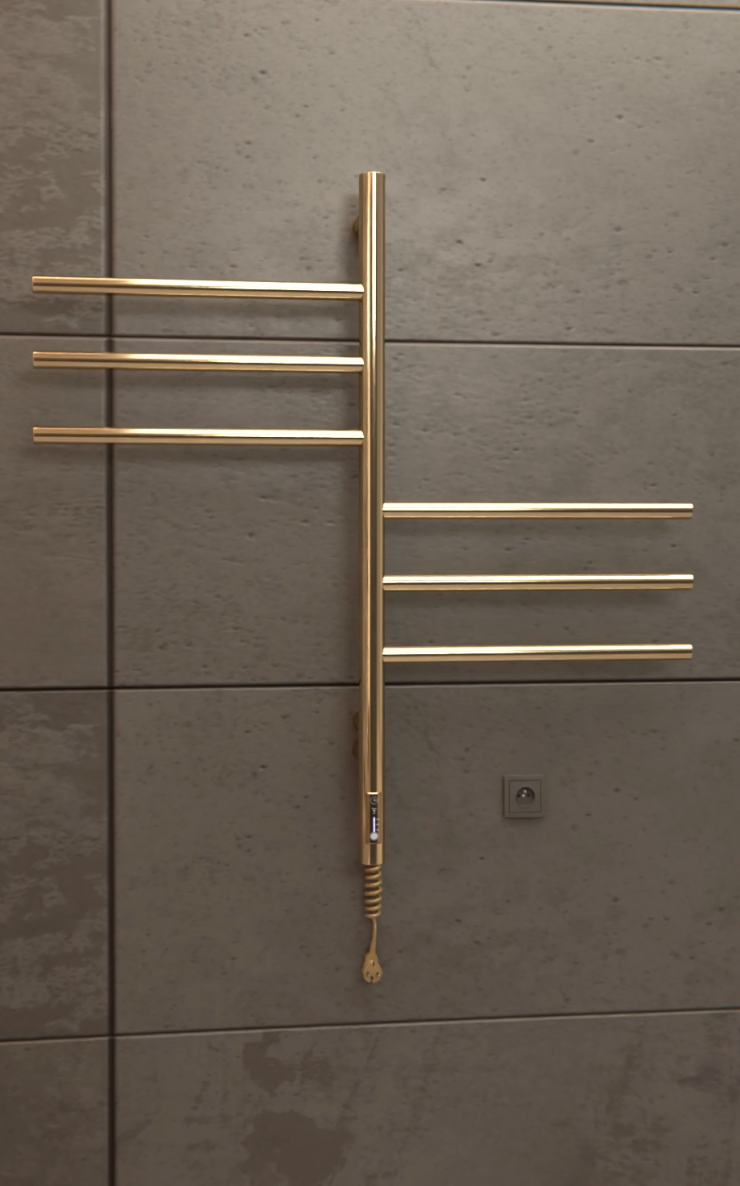 Elektryczny grzejnik łazienkowy Wertykal ze stali nierdzewnej o idealnie złoconej lustrzanej powierzchni ma 6 ruchomych przęseł, każde z których obraca się o 180° niezależnie od drugiego. Grzejnik został pozłocony metodą PVD, wszystkie elementy do montowania (przewód zasilający, nóżki mocowania) również są złote błyszczące. Odcień złota idealnie pasuje do złotych baterii marki Omnires i Grohe.Jest to grzejnik całkiem elektryczny, bardzo wygodny w korzystaniu, nie jest wodny, nie potrzebuje podłączenia do systemu centralnego ogrzewania. Ten grzejnik można podłączyć w jakimkolwiek miejscu, gdzie jest dostęp do gniazdka elektrycznego. Urządzenie jest z suchym kablem w środku i nie potrzebuje żadnych dodatkowych płynów, warto tylko podłączyć go do prądu i działa! Nagrzewa się do maksymalnej temperatury w ciągu kilku minut. Jest to niezwykle wygodne, gdy zależy na szybkim wysuszeniu prania lub podgrzaniu ręcznika dla przyjemnego wycierania się po wyjściu z kąpieli.Jeżeli łazienka jest na etapie remontu jest możliwość ukrytego systemu montowania podtynkowego, bez widocznego na zewnątrz przewodu zasilającego. Idealne rozwiązanie dla minimalistycznego wnętrza i bezpiecznego korzystania z urządzenia elektrycznego.Grzejnik został wyposażony w sterownik, który pozwala regulować temperaturę urządzenia w trzech trybach temperaturowych (45°- 55°- 65°C) oraz posiada jako opcję dodatkową timer 3h. Po 3 godzinach pracy w tym trybie grzejnik wyłącza się samodzielnie. Jest energooszczędny, pobiera bardzo mało prądu. Zaoszczędzi zużycie prądu do 70% miesięcznie.